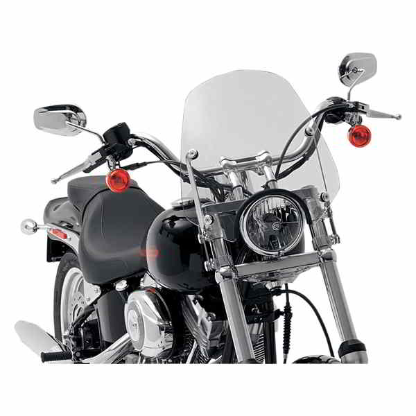 DEL REY Small sleek design that offers good protection in a minimalist package Made of Lucite? for excellent optics and durability Available in four gradient colors and solar (a light tint with 72% visible light transmission) Measures approximately 15 W x 13 H above headlight Fits most round headlights Optional Lowers available for additional windshield coverage; see page ??? No-Tool detachable Trigger-Lock mounting hardware must be ordered separately; available in polished or Night Shades black see page ??? Made in the U.S.A.