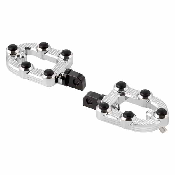 Ness MX foot pegs feature a lightweight cut through design with integrated rubber inserts resulting in a cut through design with excellent foot traction CNC machined from billet aluminum Each peg features CNC machined cuts on the top and side of the peg body for style that can be seen at every angle Rubber inserts offer foot traction and protect the finish of the peg inserts are replaceable Forged foot peg mount is splined for adjustability sold separately