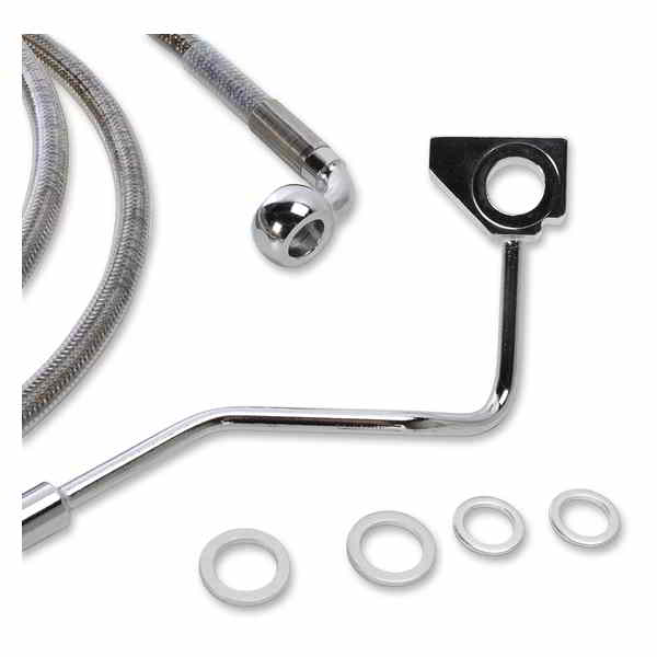 Features clear-coated stainless steel braided extended lines with chrome steel fittings For matching lower and mid lines on ABS models see standard length lines Rear lines come with chrome steel switch junction block and uses standard brake light switch Made in the U.S.A. For matching lower and mid lines on ABS models see standard length lines All measurements are approximate.