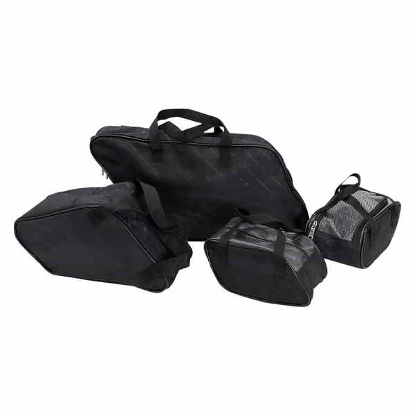 Four-piece liner set includes one full-size liner bag matched perfectly to the shape of your GL1800 saddlebag plus one vertically oriented half-sized liner used in conjunction with two quarter-sized horizontally oriented liner bags that stack neatly toge Unique design permits efficient organization of your belongings ? separate your laundry or keep rider and passenger gear divided while maximizing the capacity of your saddlebags. Unique design permits efficient organization of your belongings ? separate your laundry or keep rider and passenger gear divided while maximizing the capacity of your saddlebags Top sections of the quarter-sized liner bags are transparent with double-pull zippers so you can see the contents and get to them quickly ? perfect for items you need to grab when you're on the road Made from light but durable PVC-lined 150-denier polyester with sturdy zippers that permit over-packing but keep the elements away from your cargo Great for trips overnighters organizing your tools or cleaning supplies; simply lift your liners out of the saddlebags to move your cargo easily into the hotel campground or to unload fast once home Complete set measures: 16 x 51/4?? x 91/2?? (large liner) 71/2?? x 51/2?? x 101/2?? (medium liner); 71/2?? x 51/2?? x 41/2?? (small liner)