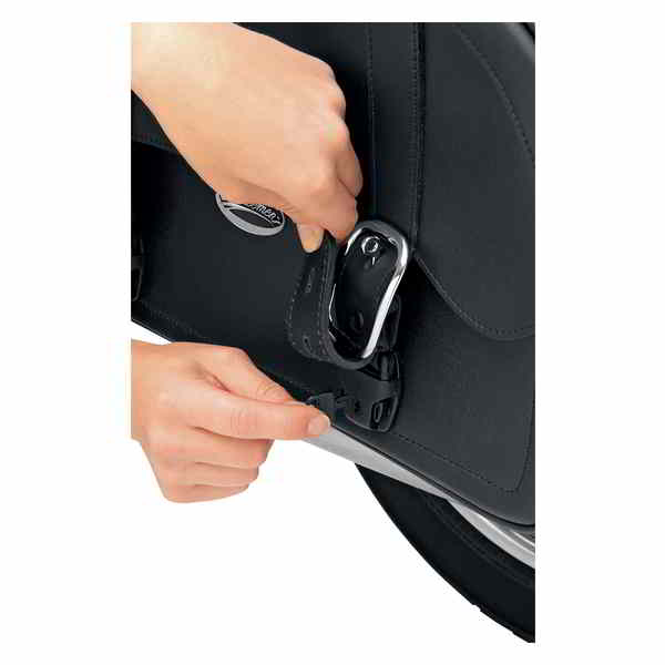 Nostalgic-look sissy bar bag; matches Desperado saddlebags Features bright chrome-plated studs chrome-plated buckles and genuine leather straps with lockable quick-release hidden buckles Features bright chrome studs chrome buckles and genuine leather straps with lockable quick-release hidden buckles Straps included for secure mounting to sissy bar or other locations on bike Measures 91/2? W x 11 H x 41/2? D
