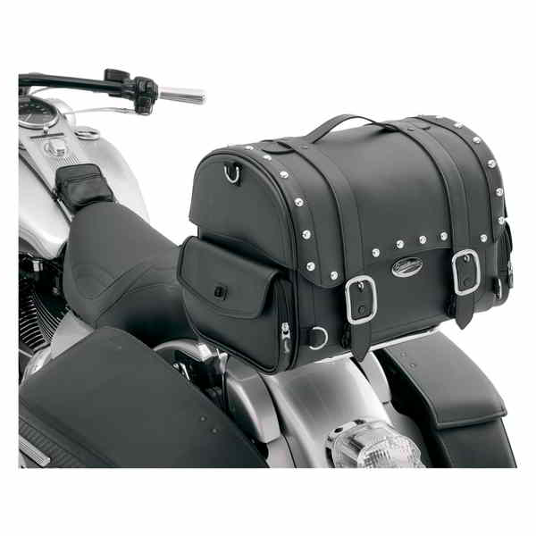 Sleek-styled tail bag featuring straps studs and large chromed buckles Lockable quick-release buckles hidden below large chrome buckles Lockable quick-release buckles hidden below large chrome buckles Made of rugged leather-grain SaddleHyde? with plastic reinforced panels Rigid construction keeps these bags looking good full or empty Designed for multiple mounting options adaptable to any bike; attaches to sissy bar rack or atop passenger seat Easy-to-use sissy bar strap included adjustable bungee straps sold separately; multiple anchor points including four heavy-duty chrome D-rings and several strap slots provided for fast easy mounting Riveted top handle and removable shoulder strap for convenient transport off the bike Hat-box style lid with long sides for protection against weather grime and other elements