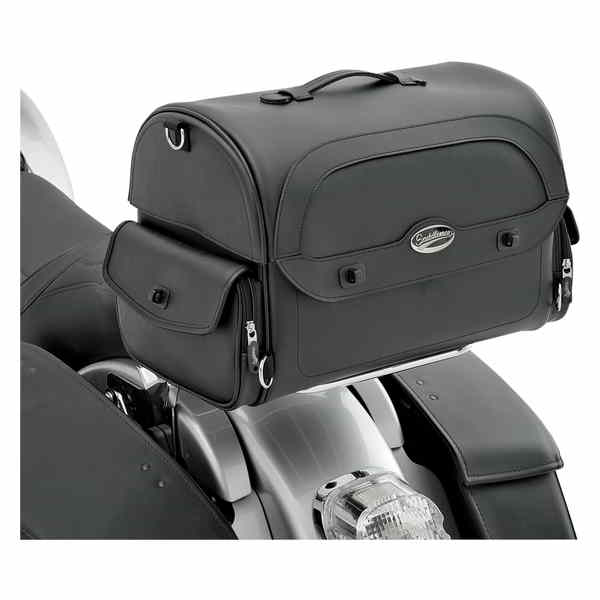 Sleek-styled tail bag made of rugged SaddleHyde and plastic reinforcing panels Rigid construction keeps these bags looking good full or empty Rigid construction keeps these bags looking good full or empty Designed for multiple mounting options adaptable to any bike; attaches to sissy bar rack or atop passenger seat Easy-to-use sissy bar strap adjustable bungee straps sold separately; multiple anchor points including four heavy-duty chromed D-rings and several strap slots provided for fast easy mounting Riveted top handle and removable shoulder strap for convenient transport off the bike Hat-box style lid with long sides for protection against weather grime and other elements Easy-open lid provides convenient access Two zippered and flap-covered side pockets provide extra storage