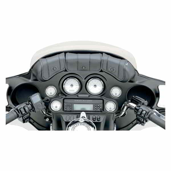 Distinctively styled windshield features large opening flaps for easy access to contents Leather-grained UV- and weather-resistant SaddleHyde bag has over 400 cu. in. of total cargo capacity in three independent pockets Leather-grained UV- and weather-resistant SaddleHyde? bag has over 450 cu. in. of total cargo capacity in three independent pockets Superbly constructed bag fits snugly with the contours of the inner dash of the classic Harley-Davidson?? bat-wing fairing Rigid construction holds bag shape even when empty; quarter-turn flap releases accept mini-padlocks so you secure your belongings in the bag Left pocket easily snaps off to permit the mounting of a Harley-Davidson?? accessory or similar-brand GPS mount Easy installation can be completed in minutes with basic hand-tools and no modification to your motorcycle