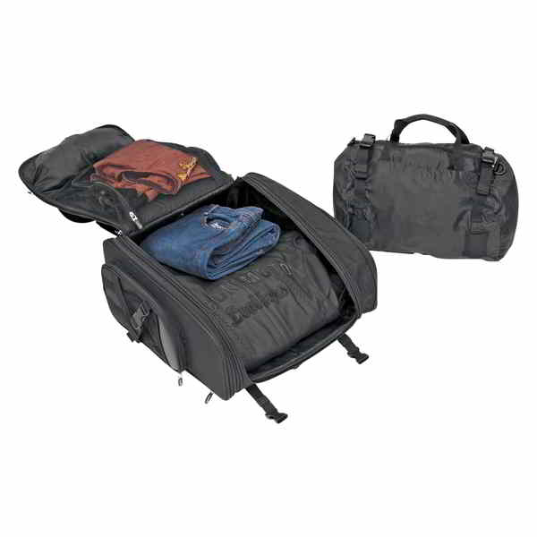 Conveniently sized for just about any trip; expandable to carry all your gear Fully adjustable sissy bar mounting system goes on in seconds over any size and style sissy bar pad; once adjusted for your size pad you never need to adjust it again Fully-adjustable sissy bar mounting system goes on in seconds over any size and style sissy bar pad; once adjusted for your size pad you never need to adjust it again Rigid construction holds bag shape even when empty Top carry handle backpack straps and shoulder strap for easy toting off bike Fold-down duffle bag included for extra capacity; attaches to S2200E's top cargo straps which can also be used to tie down a jacket rain gear etc. Five weather-resistant external pockets Top pocket office organizer and lockable zipper pulls Constructed of UV- water- and weather-resistant 1200-denier SaddleTuff? and durable maintenance-free SaddleHyde? panels