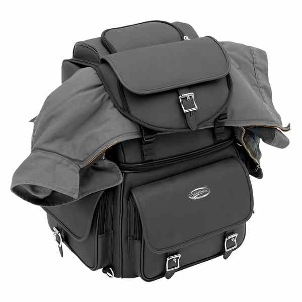 Rugged blend of leather-grained materials looks great on any type of motorcycle Rigid internal structure is strong enough to lean on even when empty Rigid internal structure is strong enough to lean on even when empty No sissy bar required Two mounting systems included: Saddlemen's Versa Mount? seat harness or adjustable sissy bar strap system easily attaches bag to motorcycle seat luggage rack or sissy bar Included backrest pad can be adjusted for additional comfort for the passenger or driver Sturdy grip handle for convenient carrying Includes detachable backpack straps for easy off-the-bike jaunts Spacious top-loading main compartment and large top-loading main compartment