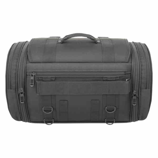 Dimensions: 18 wide x 11 deep x 10.5 tall (with an additional 3 expansion) Cubic Inches: 2300 UV-rated weather-resistant 1200D chassis End pockets expand out providing additional packing room when needed Internal molded organizer and zippered mesh pockets keep items organized Maintains shape even when empty Easily mounts to sissy bar plus full mounting strap kit offers a variety of mounting options All strap ends include unique keepers system which eliminate the need for cutting after the bag is installed Multiple heavy-duty D-rings for additional mounting or attaching options