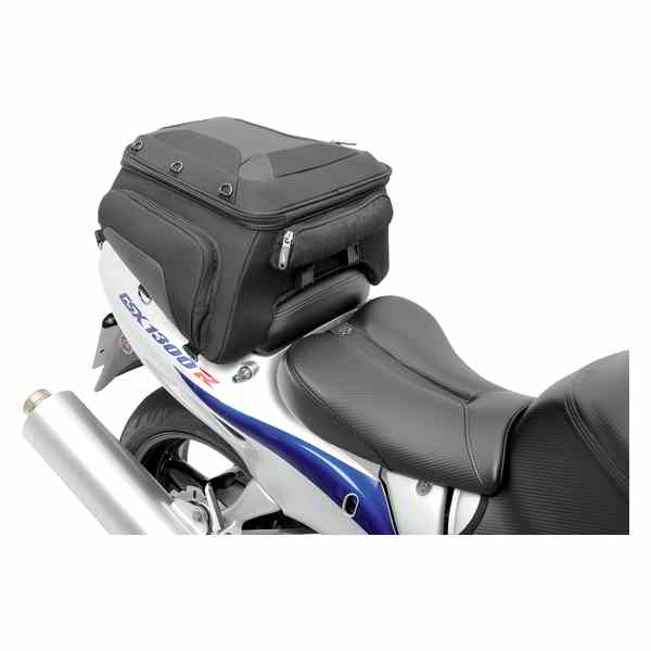 Fits rear seat/pillions with included mounting system Rugged 1200-denier SaddleTuff? construction for long life The bag's large main compartment opens a full 180° and is spacious enough for a laptop computer and has a tech-organizer for smart-phones digital cameras or MP3 players Three internal pockets and three big exterior pockets allow easy access when on the go; two of the exterior pockets expand an additional 2 for extra storage Rugged 1200-denier SaddleTuff? semi-rigid construction is water-resistant with an integrated rain cover Thirteen exterior D-rings for attaching other items like jacket or other luggage (six concealed D-rings to prevent scratching) Comfortable carry handle allows the bag to be used as a suitcase when off the bike STANDARD MODEL fits bikes with a 9 W or smaller rear seat/pillion like a Suzuki GSX-R600/750 a Yamaha R1 or a Dual Sport motorcycle; the base's tunnel dimensions are 9 W in front and tapers down to 6 W in rear x 3 D x 15 L. The bag's exterior dimens WIDE MODEL fits bikes with a 12 W or smaller rear seat/pillion like a Suzuki Hayabusa a Honda Shadow or a Yamaha FZ1; the base's tunnel dimensions are 12 W in front and tapers down to 9 W in rear x 3 D x 15 L; exterior dimensions are 15 L x 21 W x