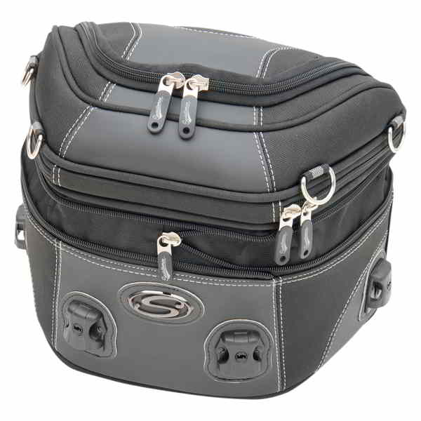 Shaped to match the rear rack or grab rails of most Adventure or Sportbikes Perfectly sized to carry adequate cargo Styled to look great and to overcome any tough environment Easy to install with quick-release lockable buckles Expandable to hold an impressive amount of cargo Each bag has a rain cover for extra weather protection PILLION AND REAR RACK BAG Lines up with the rear seat and rear rack of most Adventure motorcycles Takes advantage of Saddlemen's Adventure TRACK seats' cargo mounting points
