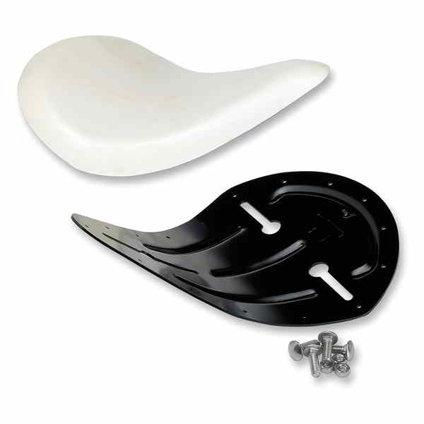 SLIMLINE SOLO SEATS FOR CUSTOM/RIGID Same features and construction as Solo seats with a deeper side profile contour for bikes with steep backbones Heavy-gauge stamped steel pan with gently sloping rear kick for added support Stamped-in ridges on the pan increase stiffness and give the pan a clean classic look with a matte black electroplated finish Covers are hand-stitched heavy-duty black vinyl Foam is molded polyurethane approximately 1 thick Uncovered seat also available to allow riders to customize to their liking A unique carriage bolt system on the underside of the seat pan allows builders to fine tune the location of the seat hinge and both springs
